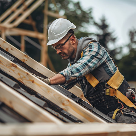 A dedicated worker carefully installs wooden beams on a new roof. The sun shines brightly, highlighting the craftsmanship and effort involved in this vital construction task.