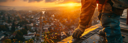 Skilled roofer in work attire fixing roof with urban city skyline in the background
