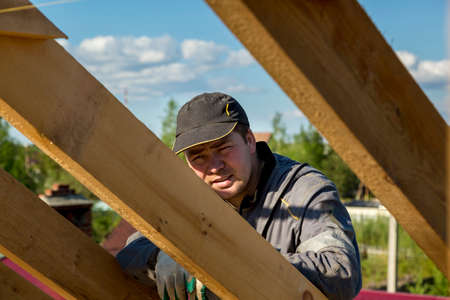 Wooden roof beam from framework. House roof at construction site. Roofer working on roof structure of building on construction site. Wooden roof beams. Roofing nails or screws for OSB sheets.