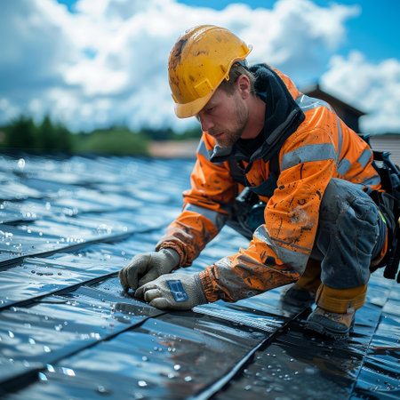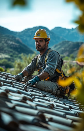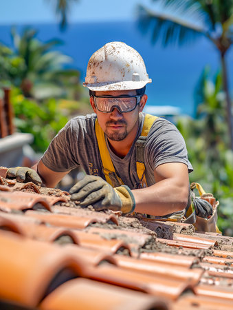Construction Worker in Safety Gear Installing Roof Tiles with Precision and Care.
