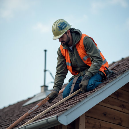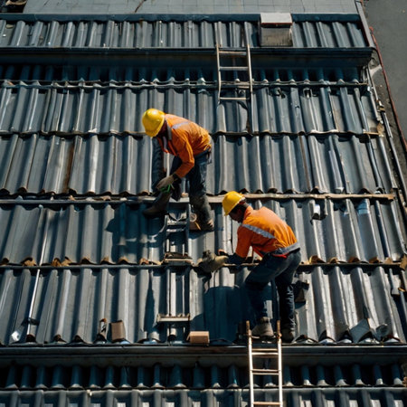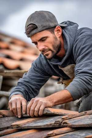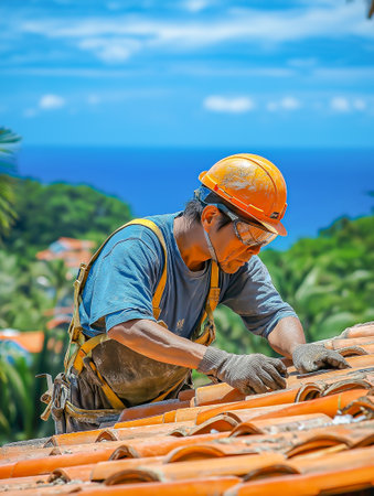 Construction worker carefully placing terracotta roof tiles, maintaining the integrity of a historic building