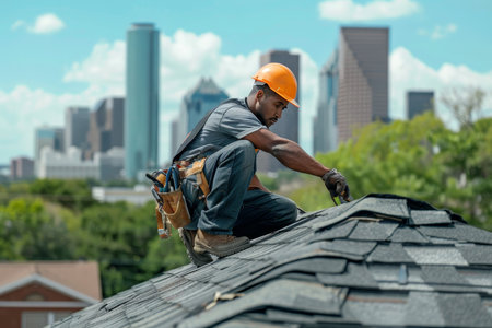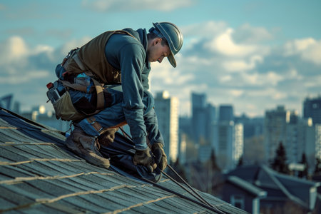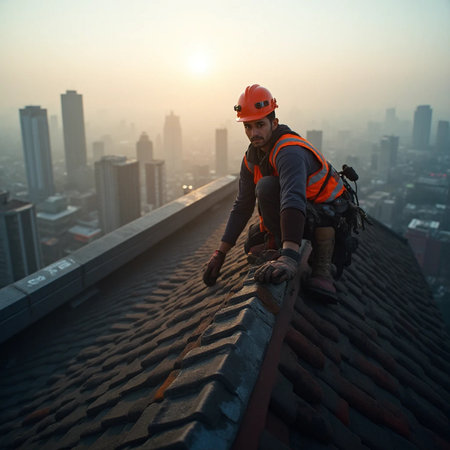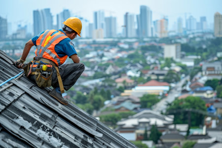 Skilled roofer in work attire repairing roof with urban city skyline in the background