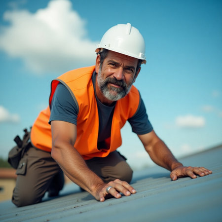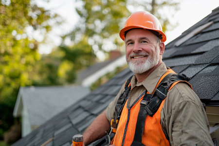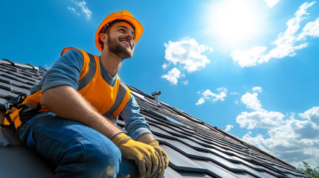A cheerful contractor enjoys a sunny afternoon while working on a rooftop. Wearing safety gear and a bright orange hard hat, he showcases his skills amid a tranquil suburban neighborhood.