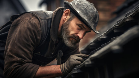 The master repairs the roof tiles of the house. Roofing, repair and renovation work. Generative AI