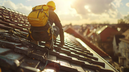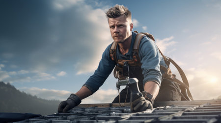 Diligent roofer at work securing shingle scenic view