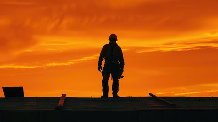 Rooftop inspection scene with construction worker silhouetted against orange sky