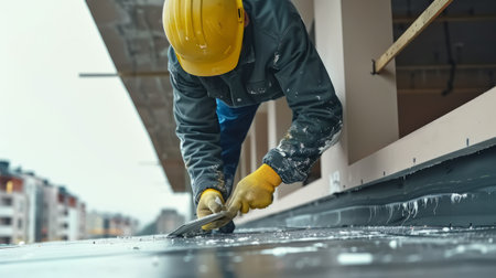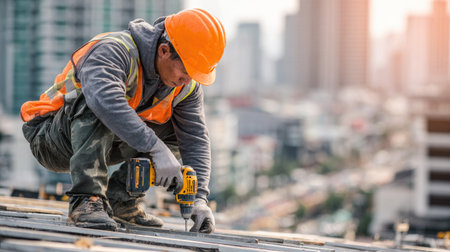 A dedicated construction worker in safety gear diligently uses a power drill on a rooftop in an urban landscape, showcasing craftsmanship and hard work.