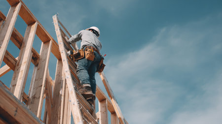 A construction worker ascends a ladder on a wooden frame, showcasing skill and safety. The blue sky serves as a backdrop, symbolizing progress in building projects.
