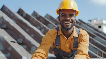 Construction worker smiling on a rooftop under a clear blue sky during a sunny day while taking a break from work. Generative AI