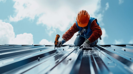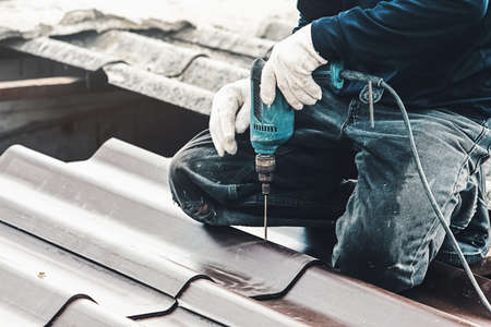 [Construction roof] Roofer worker in protective uniform wear and gloves, Construction worker install new roof,Roofing tools,Electric drill used on new roofs with Metal Sheet.