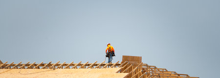 Close up shot of Construction worker wearing safety harness,Working at height on top of the new roof.