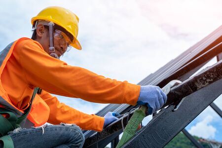 Roofer working on roof structure of building in construction site, Roof metal sheet construction concept.