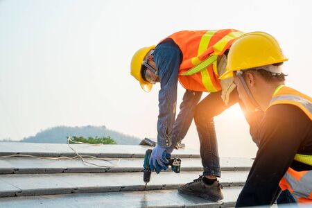 Engineer workers install new roof, roofing tools, electric drill, use on new roof with roof house construction idea.