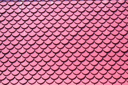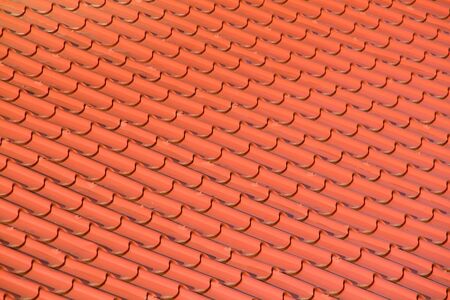 Traditional red brown ceramic roof tiles pattern background, close up, low angle side view