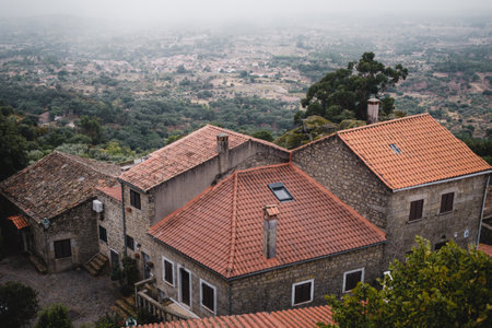 Portuguese houses in the village of Monsanto, Portugal, into the fog.