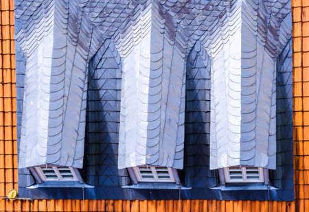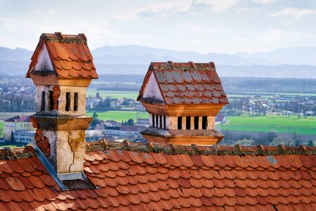 Red tile roof with chimneys in Ptuj Castle in Slovenia. Fragment of Architecture of Ptujski grad in Slovenija.