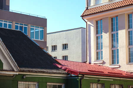 Pano Dark color roof of houses viewed against cloudless blue sky on a sunny day. Architectural details of homes with beige and blue exterior walls.