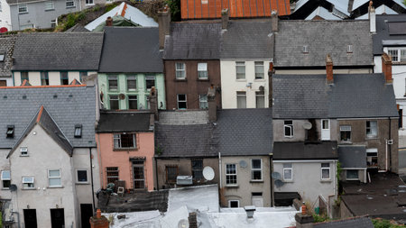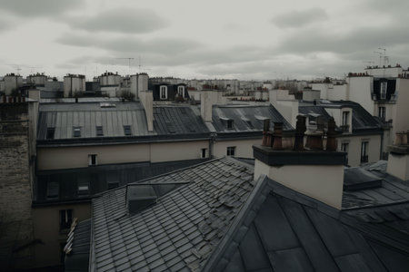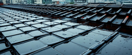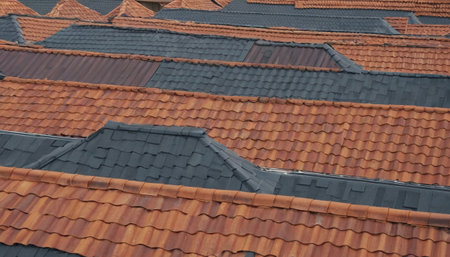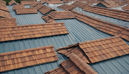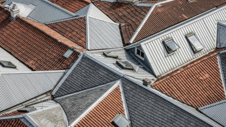 A stunning aerial view reveals a patchwork of rooftops in an urban landscape, showcasing a mix of red, gray, and black tiles. Vivid colors and unique shapes blend harmoniously.