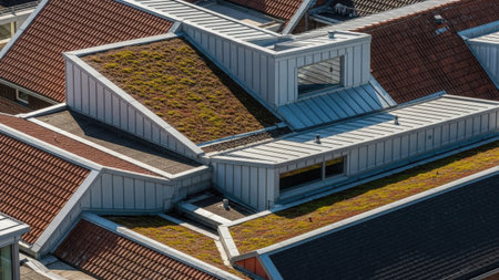 Background texture inspired by the varied design of the roofs of urban buildings, drone footage. Generative AI