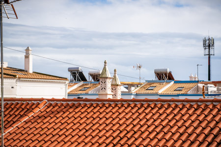 Red terracotta roofs with traditional chimneys and solar heaters under a blue cloudy sky