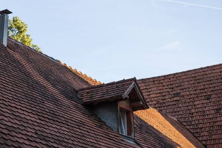 Tight shot of housetop during sunset with nice sunny blue background. Detailed building architectural abstract property closeup