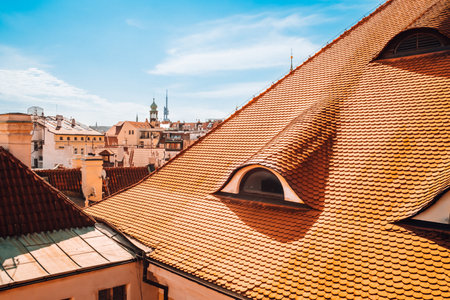 View from terrace on Prague buildings roofs with typical traditional red roof tiles. Czech republic, old european city.