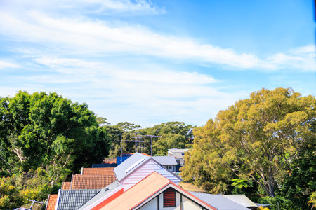 An aerial view captures a vibrant suburban neighborhood on a sunny day. The image showcases a variety of colorful houses with different roof styles, set amidst lush green foliage. Many of the houses have windows that provide glimpses into the homes' interiors, hinting at the families and lives that inhabit this peaceful community.