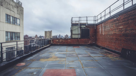 An empty rooftop with industrial elements, exposed brick, and metal railings, offering a rugged urban aesthetic