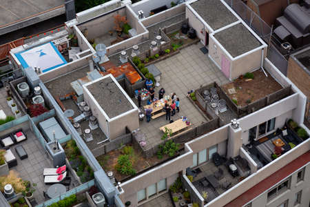 Downtown Vancouver, British Columbia, Canada - June 22, 2018: Aerial view from above of people enjoying a summer evening on top of the roof.