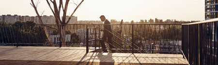 Roof terrace high above the rooftops of Prague's old town under a cloudless sky in the evening with free text space