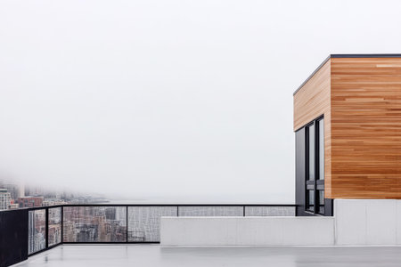 A sleek modern balcony features wood accents and a smooth gray surface, providing a vantage point over a fog-drenched city below, creating a serene and minimalist ambiance.