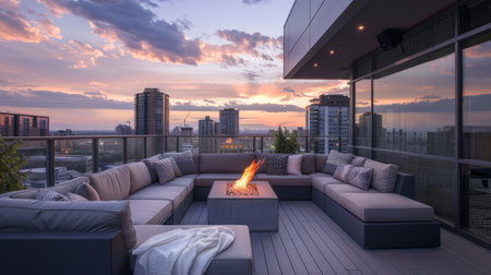 a sleek and modern terrace featuring glass railings, an outdoor sectional sofa, and a minimalist fire table, set against the backdrop of a dramatic skyline