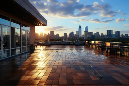Empty cafe terrace with panoramic view of city skyline at sunset.