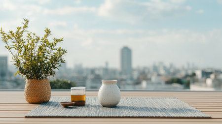 A serene outdoor scene featuring a small plant, a teapot, and a cup on a textured mat, with a city skyline in the background.