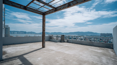 Empty rooftop space with city skyline and mountains in background under a clear blue sky, ideal for urban lifestyle and architecture photography