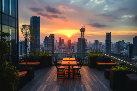 A rooftop bar overlooks a cityscape painted by a stunning sunset. The composition showcases a modern bar setting with tables and chairs. The warm, dynamic colors of the sky blend with the silhouettes of the buildings creating an impressive visual appeal. Suitable for commercial or editorial applications.