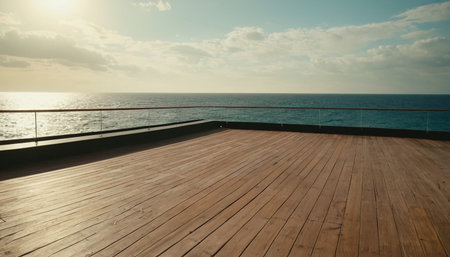 Sunset over tranquil coastline, wooden table on outdoor deck, relaxation generated by artificial intelligence