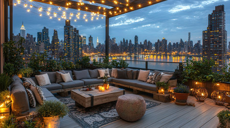 rooftop terrace transformed into a chic outdoor living room with panoramic city views and cozy seating.
