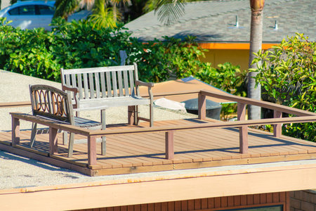 Wooden tables and chairs on the roof of an apartment building overlooking the panorama of the city with brick houses