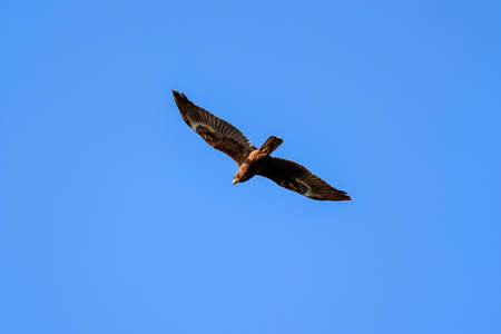 The bird of prey Black Kite flying in blue Sky. The black kite, Milvus migrans, is a medium-sized bird of prey.