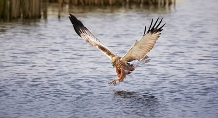 Circus aeruginosus bird flying away with a large fish it just caught from the sea Red Kite, The best photo.