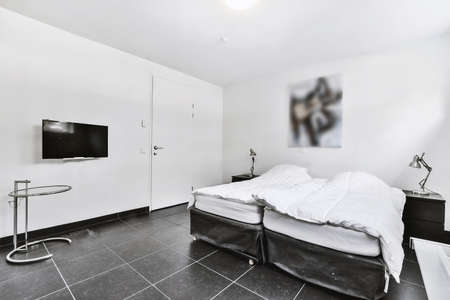 Morning interior in bedroom hotel. Bright and clean interior design of a modern room with bed, chair and houseplant. Mirrors on walls