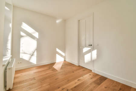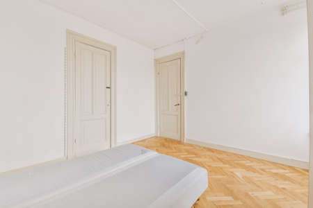 Interior of empty white room with large balcony windows and wooden parquet floor