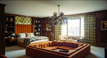 Bedroom decor, home interior design . Mid-Century Modern Bohemian style with Accent Wall decorated with Wood and Textile material . Generative AI AIG26.