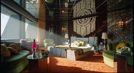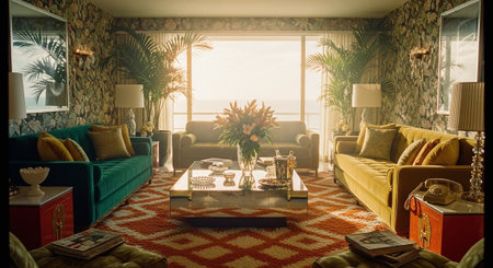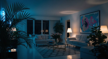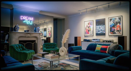 A luxurious interior featuring bold art pieces, elegant furniture, and dramatic lighting, creating a refined and cozy atmosphere.