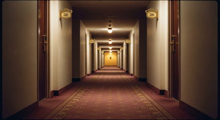 Dimly Lit Empty Hallway with Symmetrical Doors and Distant Window