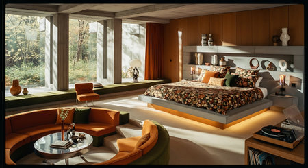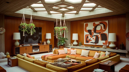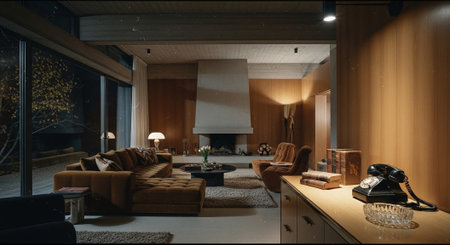 Interior design of Living Room in Mid-Century Modern style with Large fireplace decorated with Patterned rug, leather chair material. Mid-century modern architecture. Generative AI AIG24.