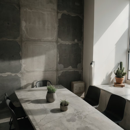 A modern meeting room with wooden table and white chairs, natural light, plants, and textured wall creating calm atmosphere