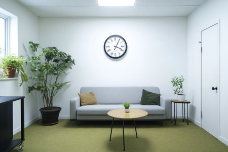 A simple living room with white walls, a gray sofa, and an olive green carpet. A small side table is placed to the left of the couch with some plants inside it. There's also a black clock hanging on the wall above to display the time. The photo was taken from a front view. It has a high resolution and natural lighting. This photo will be used for advertising and social media promotion. --ar 3:2 --v 6.1 Job ID: 6d0c4bea-04e1-4e30-bfc2-357eb4e938a8