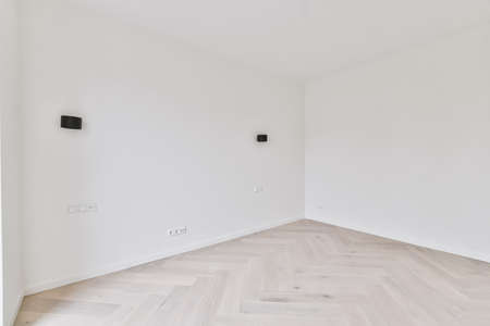 Interior of a modern office lobby with a concrete wall and a wooden floor